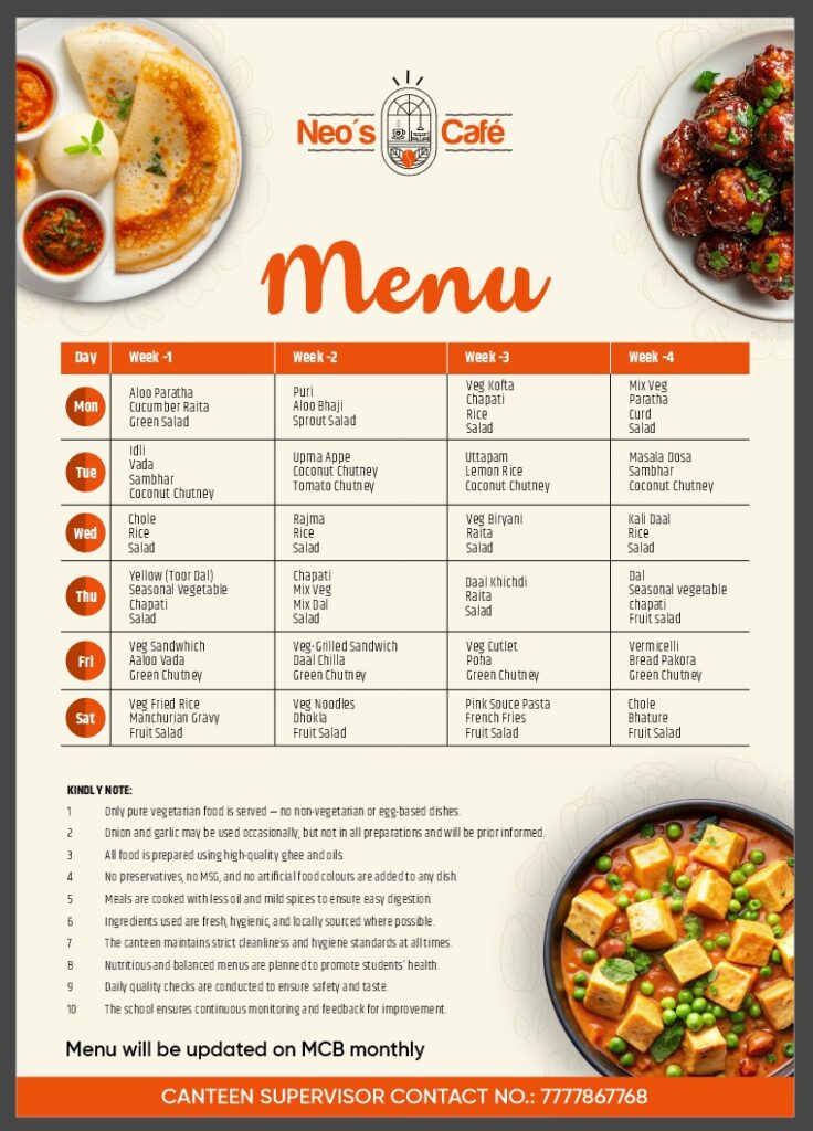 Welcome to Neo’s Cafe, the heart of Neoteric School, where nourishment meets innovation. Our cafeteria is designed to give students a healthy, hygienic, and refreshing food experience every single day.